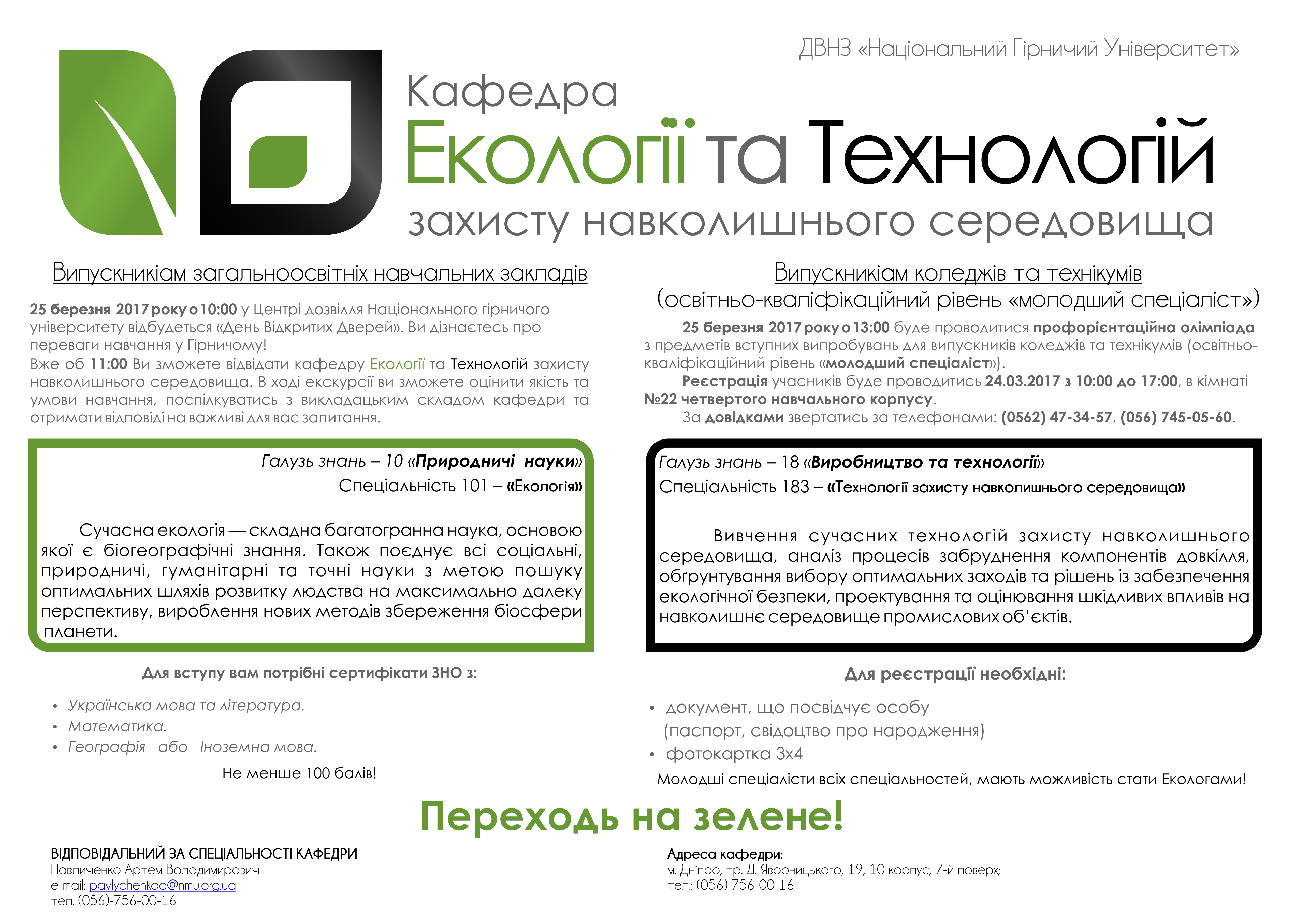 Заявка на екскурсію на кафедру екології та технологій захисту навколишнього середовища НТУ "Дніпровська політехніка":