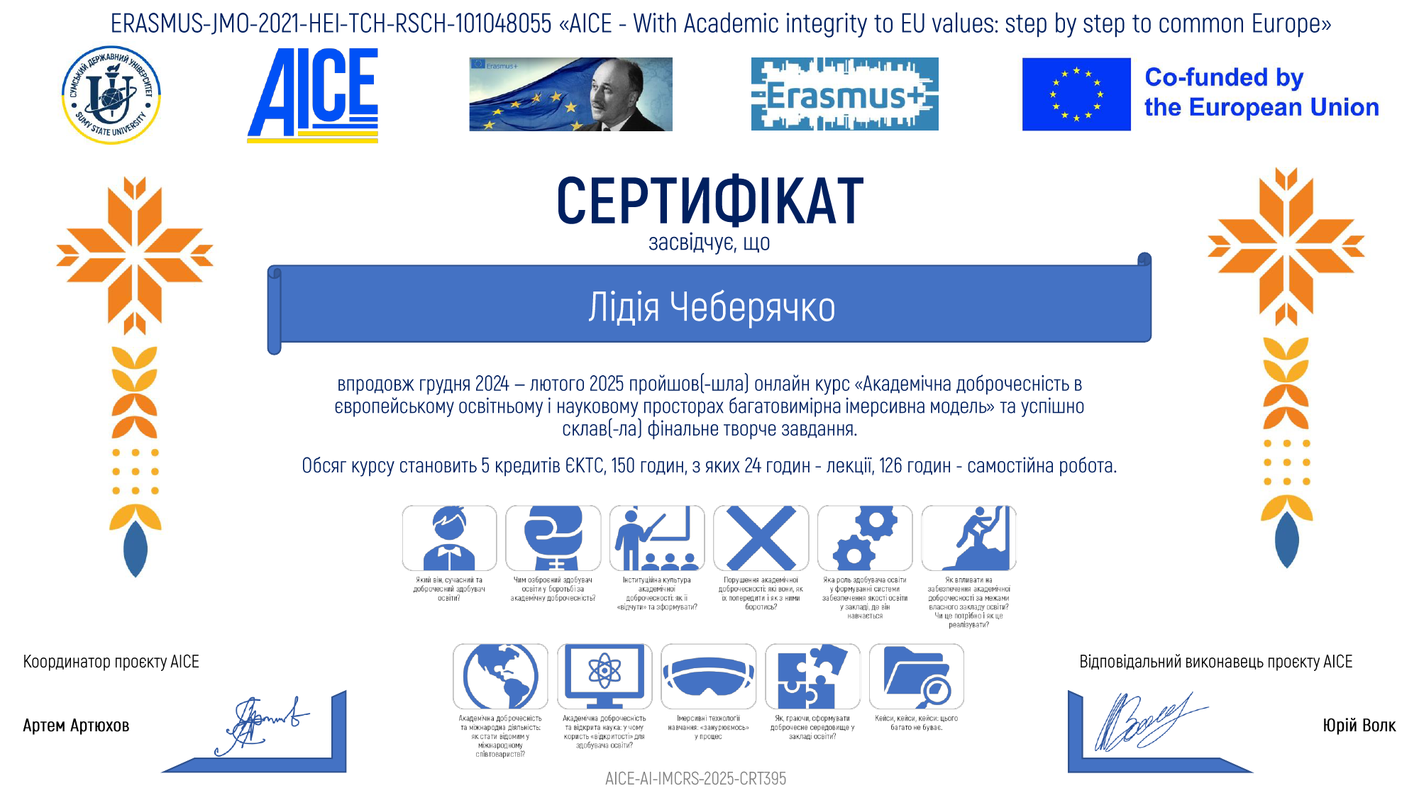 Ми пишаємося нашою талановитою аспіранткою Лідією Чеберячко, яка успішно взяла участь у престижному міжнародному проєкті «AICE - With Academic integrity to EU values: step by step to common Europe» (ERASMUS-JMO-2021-HEI-TCH-RSCH-101048055), фінансованому Європейським Союзом! 🇪🇺✨