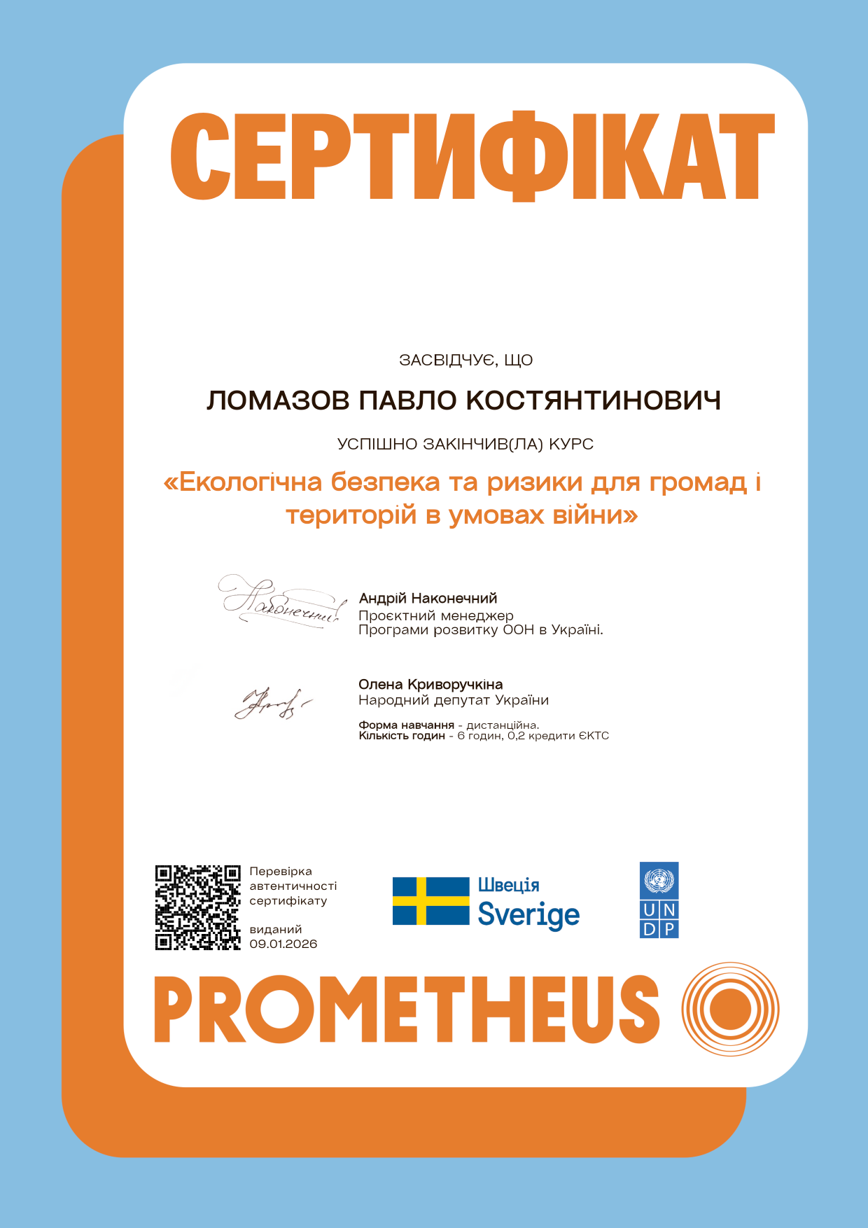 8. Міністерство цифрової трансформації України, освітній серіал «Одна планета: 11 кроків назустріч довкіллю» на платформі Дія.Освіта, сертифікат № С0080531321; 0,1 кредит ЄКТС (3 години). 29 березня 2025 року.
