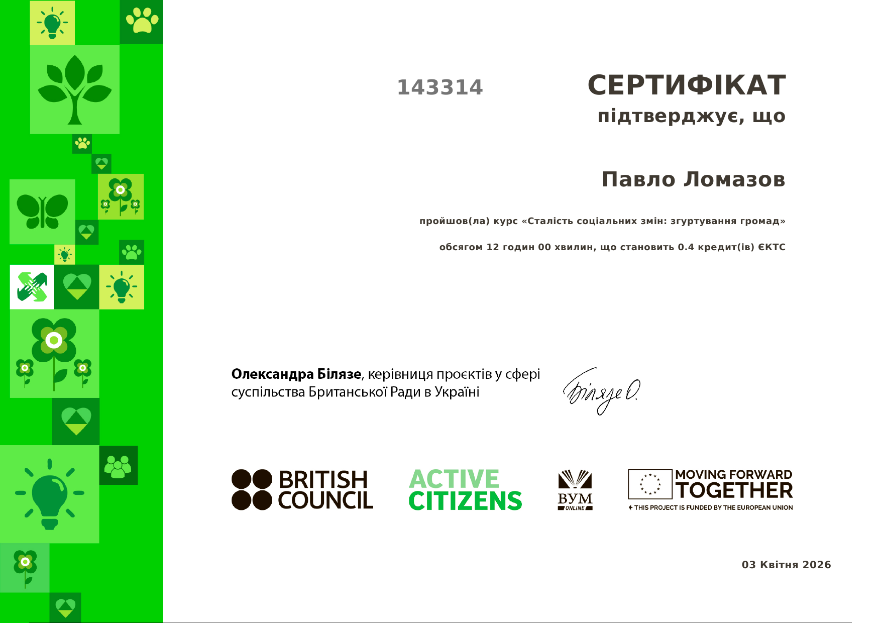 10. dáli, курс «Act further: Sustainable development for civic activists», сертифікат №123258; 0,9 кредитів ЄКТС (27 годин). 2 квітня 2025 року.