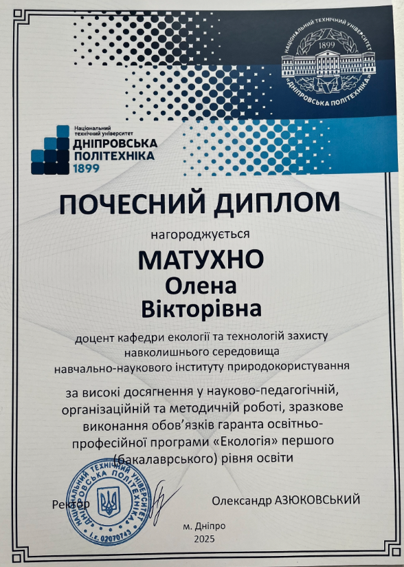 Матухно Олена Вікторівна - у 1999 році закінчила Національну металургійну академію України (НМетАУ) за спеціальністю "Екологія", отримала кваліфікацію спеціаліста екології, диплом з відзнакою.