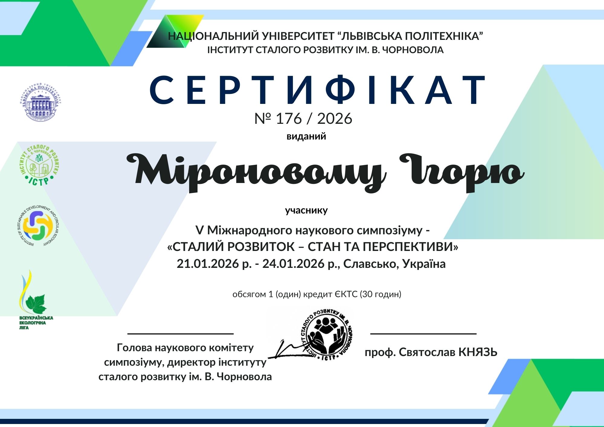 2. Міронов І. В. Перспективи комплексного використання методів спектроскопії та комп’ютерної томографії для дослідження біологічних та фізико-хімічних процесів у структурованих ґрунтах / Міронов Ігор Вікторович, Бучавий Ю. В. // Тиждень студентської науки – 2023 : матеріали 78-ої студентської науково-технічної конференції (Дніпро, 24-28 квітня 2023 року). – Дніпро : НТУ «ДП», 2023. – С. 287-289.