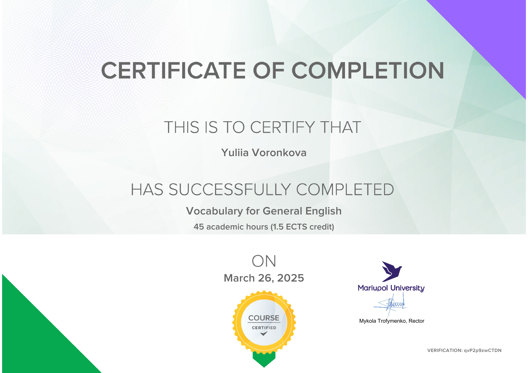 Онлайн електронна платформа з вивчення англійської мови English4Ukraine, Маріупольський державний університет за підтримки британського благодійного фонду та компанії Reallyenglish.com Limited, курс "Vocabulary for General English" (17.01.25-26.03.25), certificate of completion (Certificate code of VERIFICATION: qvP2p9zwCTDN), 26/03/2025, 45 годин (1.5 ECTS credit)