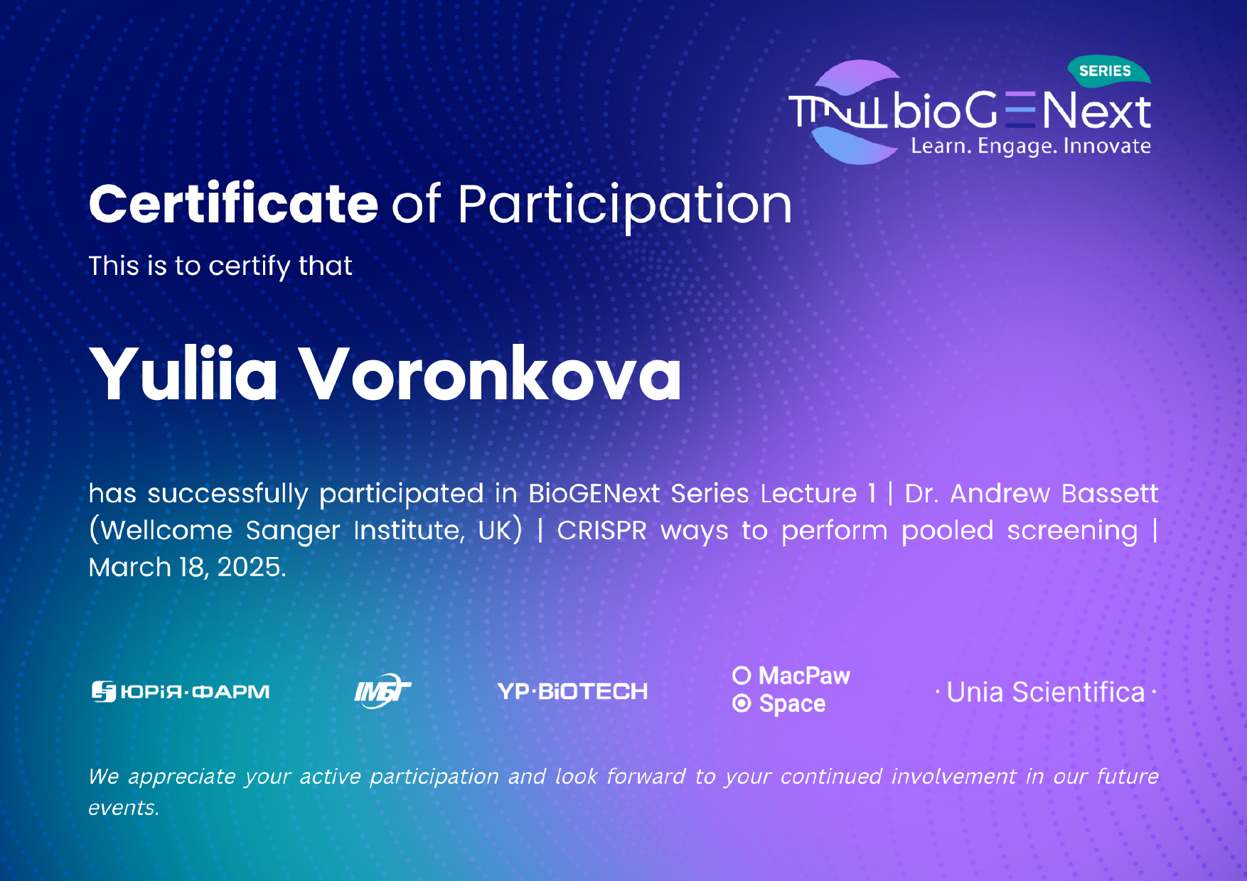 ДУ «Центр громадського здоров’я Міністерства охорони здоров’я України», сертифікат 2024-1166-5501675-287382, дистанційний онлайн-курс «Основи екстракції нуклеїнових кислот і полімеразної ланцюгової реакції (ПЛР)», 23.09.2024, 6 год.