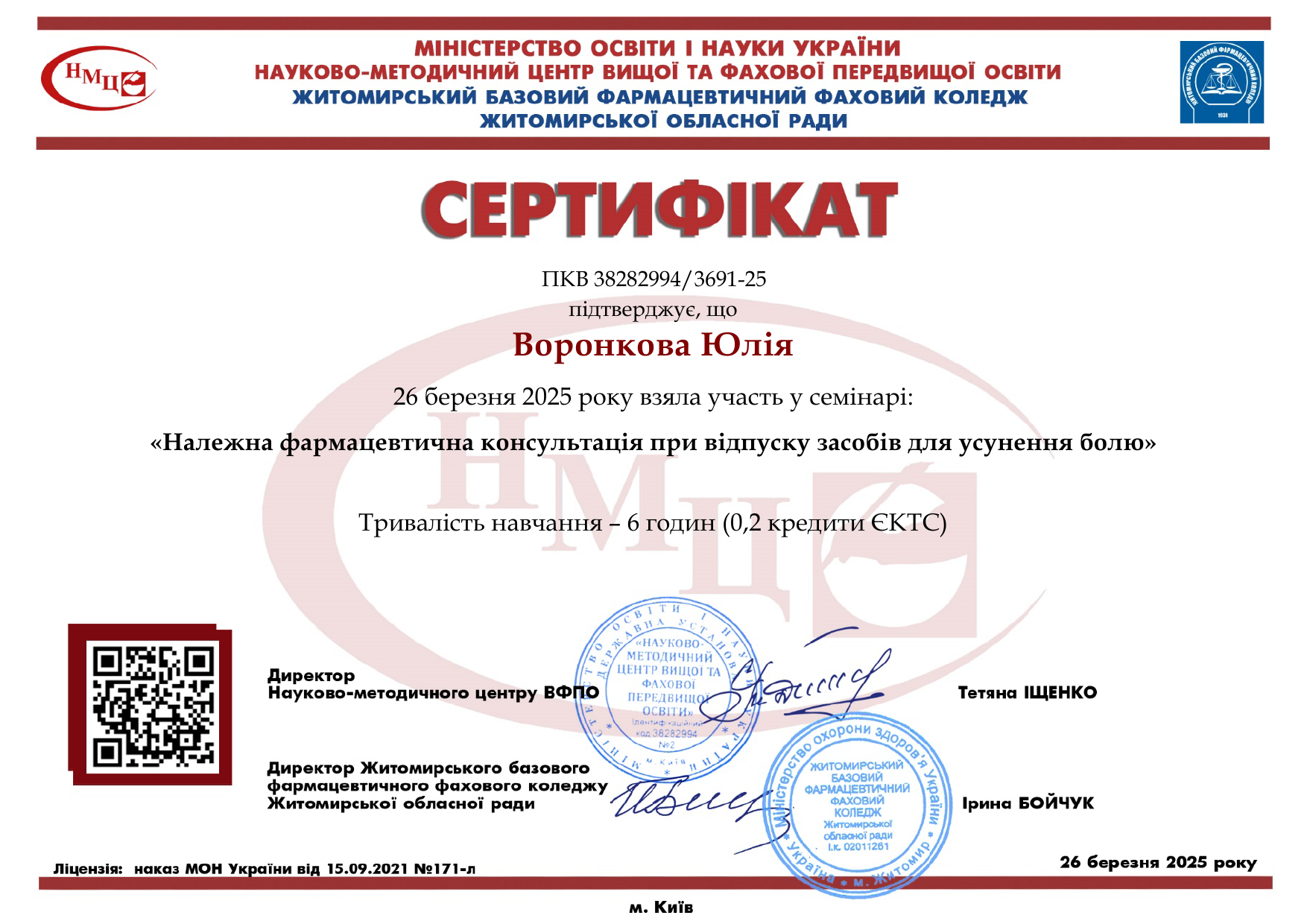 МОН України, Науково-методичний центр вищої та фахової передвищої освіти, онлайн-вебінар «Належна фармацевтична консультація при відпуску засобів для усунення болю», сертифікат ПКВ 38282994/3691-25, 26.03.2025, 0,2 кредити ЄКТС (6 год.).