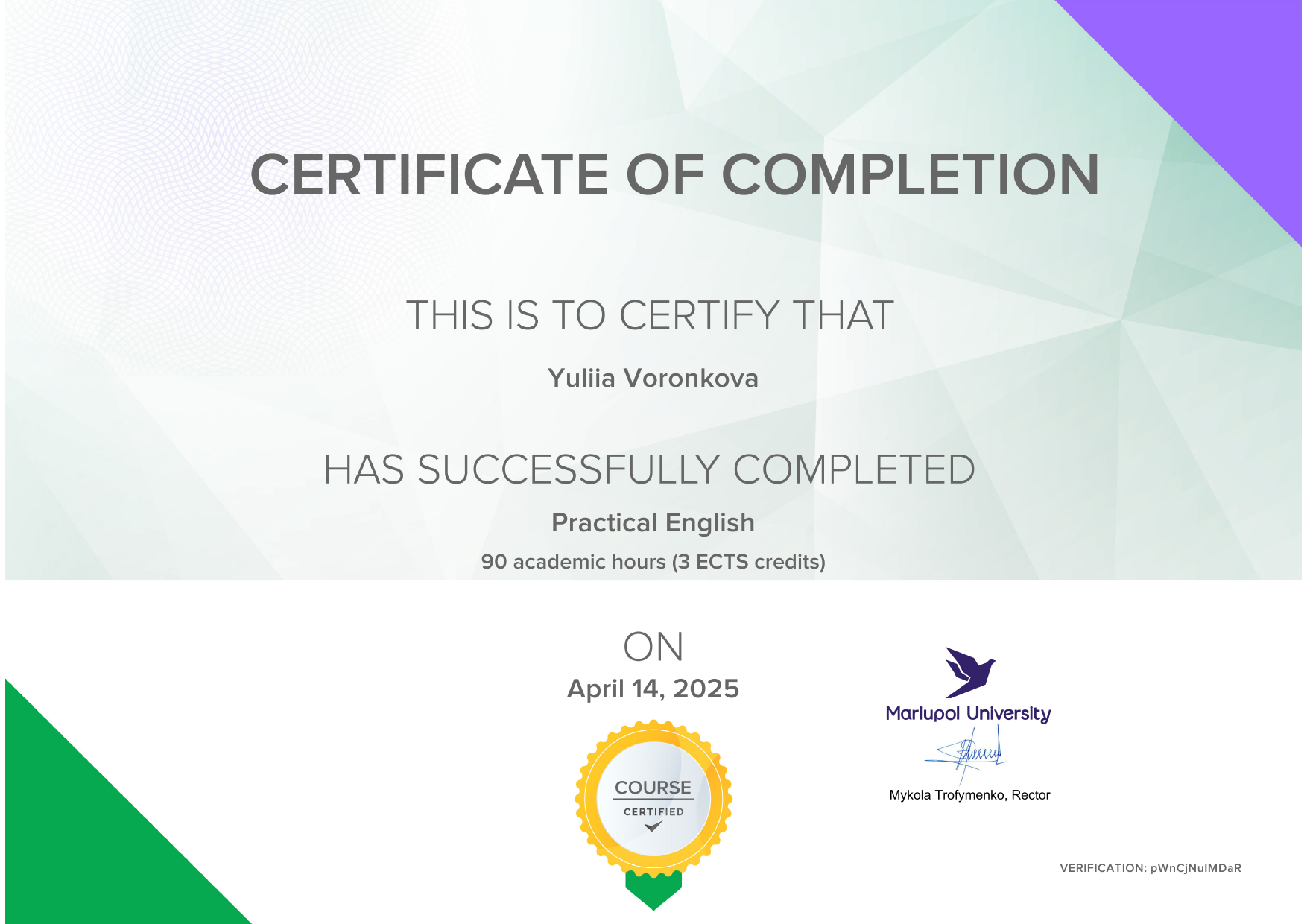 Онлайн електронна платформа з вивчення англійської мови English4Ukraine, Маріупольський державний університет за підтримки британського благодійного фонду та компанії Reallyenglish.com Limited, курс "Practical English" (17.01.25-14.04.25), certificate of completion (Certificate code of VERIFICATION: pWnCjNuIMDaR ), 14/04/2025, 90 academic hours (3 ECTS credit).