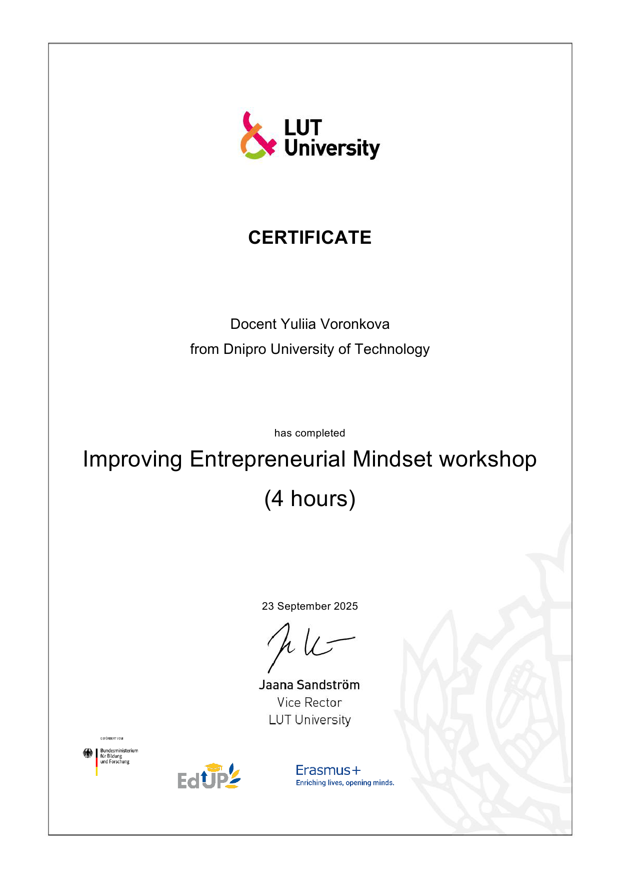 Дрезденський університет, за підтримки Німецької служби академічних обмінів (DAAD) в рамках проекту «Establishment of German-Ukrainian University Network for Securing Successful Education in Ukrainian Universities in Time of War and Crisis» програми фінансування «Ukraine digital: Ensuring academic success in times of crisis, 2023», сертифікат DL 2023124, міжнародне стажування The Professional Development Online Training Course “Creating effective video content for a digital laboratory”, (01.11.-30.11.2023), 1 кредит ECTS (30 годин).