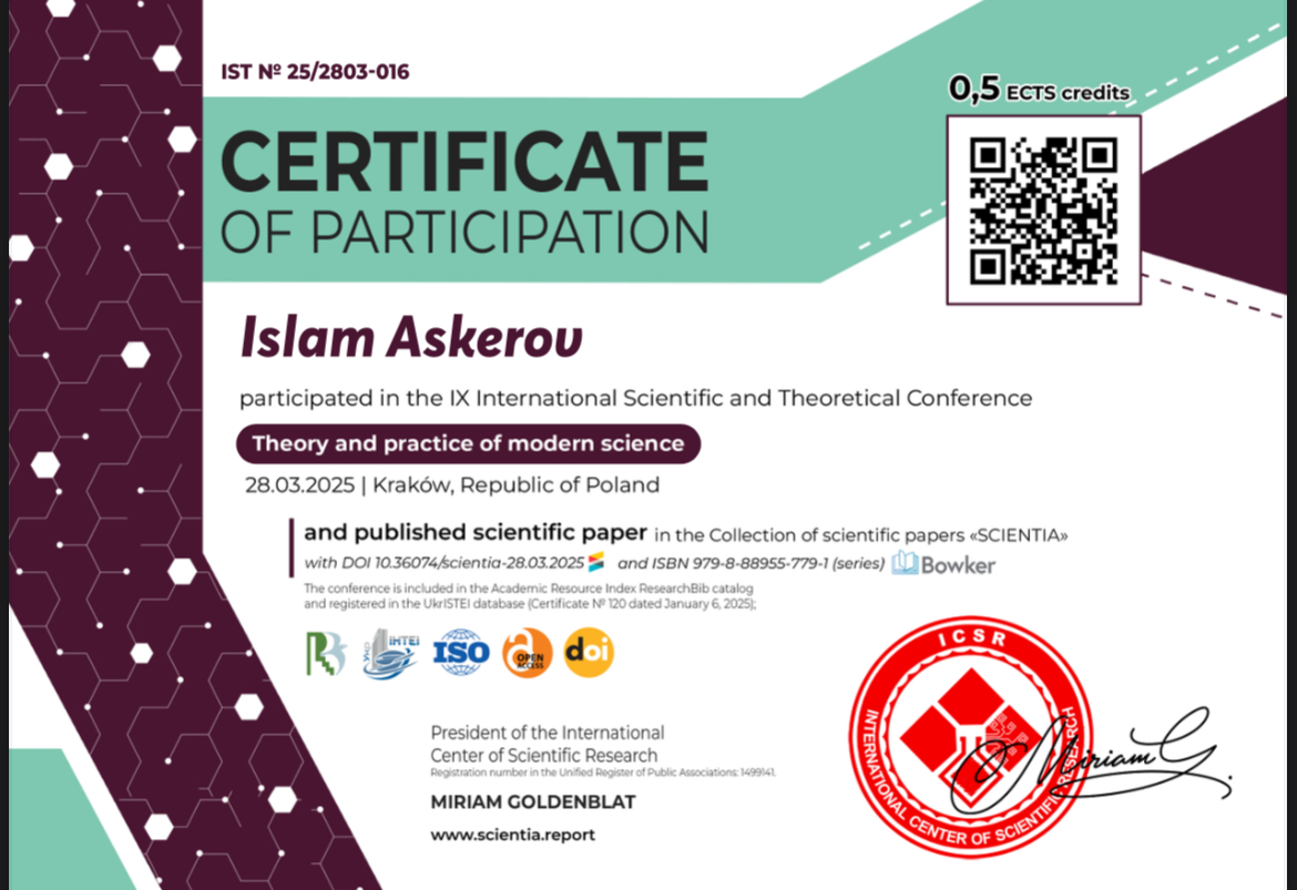 З радістю повідомляємо, що студент групи 183м-23н-1 Іслам Аскеров успішно взяв участь у конференції "II International Scientific and Theoretical Conference Scientific review of the actual events, achievements and problems" та опублікував свою наукову роботу у Збірнику наукових праць «SCIENTIA».