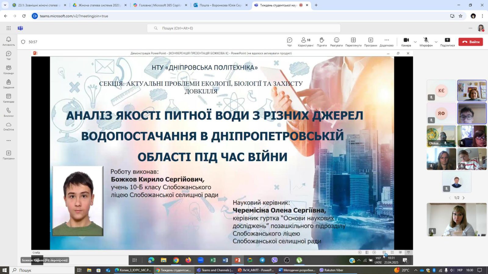Участь у конференції взяв студент групи 183м-23н-1 спеціальності "Технології захисту навколишнього середовища" Іслам Аскеров. Під керівництвом доцента Павличенка А.В., доцента Ігнатова А.О. та старшого викладача Расцвєтаєва В.О. він виконав наукову роботу на тему: "Вивчення властивостей меліораційних свердловинних вод з огляду на необхідність збереження якості ґрунтів".